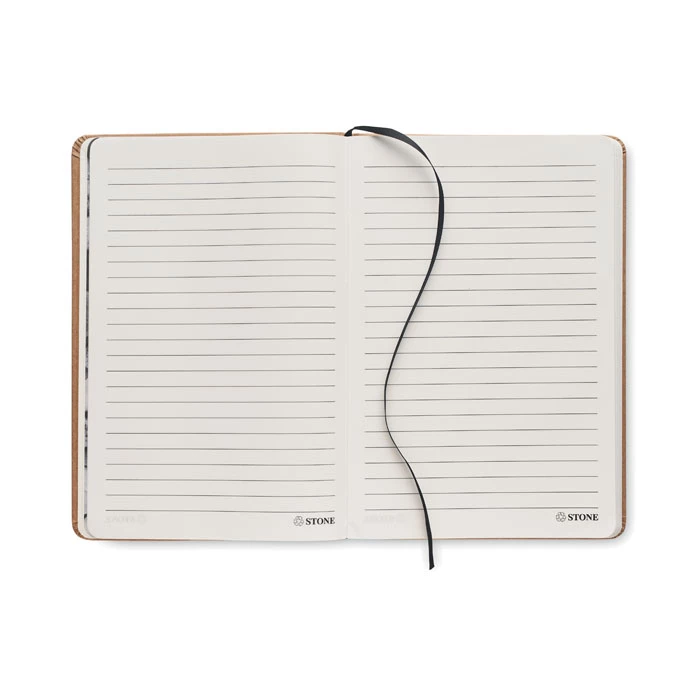 Notatnik A5 z twardą okładką z recyklingowanego kartonu. 160 z papieru w linie (80 kartek) papier mineralny. Dopasowana gumka zamykająca i tasiemka do oznaczania stron. FSC®-certified | FSC MIX CREDIT, P7.1 , FSC-C213206
