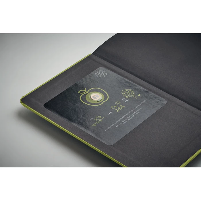 Zeszyt A5 w twardej okładce. 184 strony (92 kartki) w linie. Papier pochodzi z recyklingu. Zakładka z bawełnianej tasiemki. Zawiera nasiona roślin. Wyprodukowano w UE. Ten ekologiczny notatnik doskonale wpisuje się w nurt zrównoważonych produktów promocyjnych. Jest wyjątkowym upominkiem reklamowym. W środku znajdują się nasiona, które możesz zasadzić. Każdemu kolorowi okładki przyporządkowana jest inna roślina. Borówka (04), truskawka (05), biała stokrotka (13), jabłoń (48) oraz sosna (60).