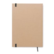 Notatnik A5 w twardej okładce z kartonu z recyklingu. 200 stron w linie z papieru makulaturowego (100 kartek 80 g/m²). Dopasowana gumka zamykająca i tasiemka do oznaczania stron. Made in EU.