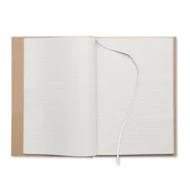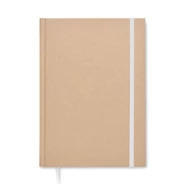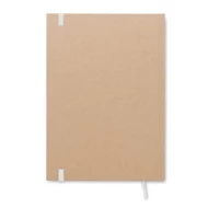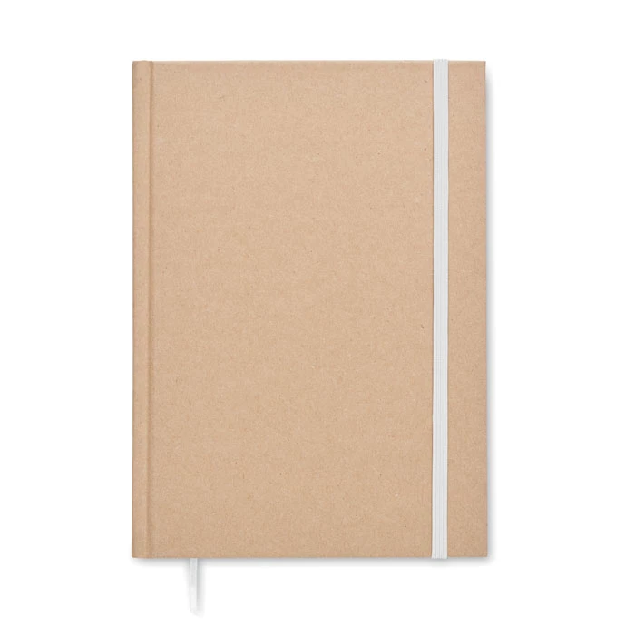 Notatnik A5 w twardej okładce z kartonu z recyklingu. 200 stron w linie z papieru makulaturowego (100 kartek 80 g/m²). Dopasowana gumka zamykająca i tasiemka do oznaczania stron. Made in EU.