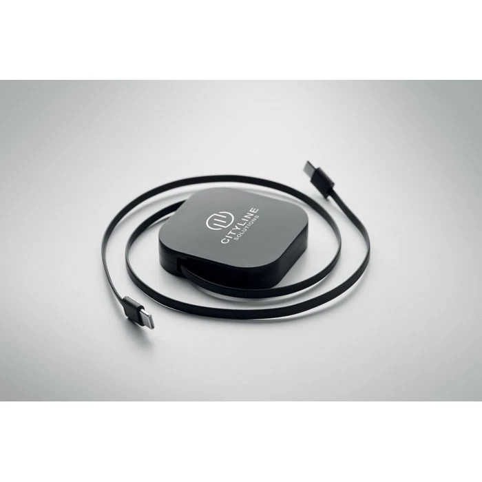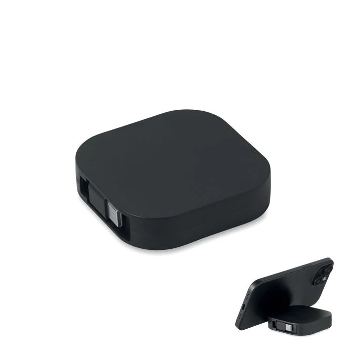 Zwijany kabel do ładowania i transmisji danych o mocy 100 W. Zawiera funkcję uchwytu na telefon. Kabel PVC z obudową ABS do zasilania i przesyłania danych (480 Mb/s). Połączenie Type-C do Type-C.
