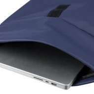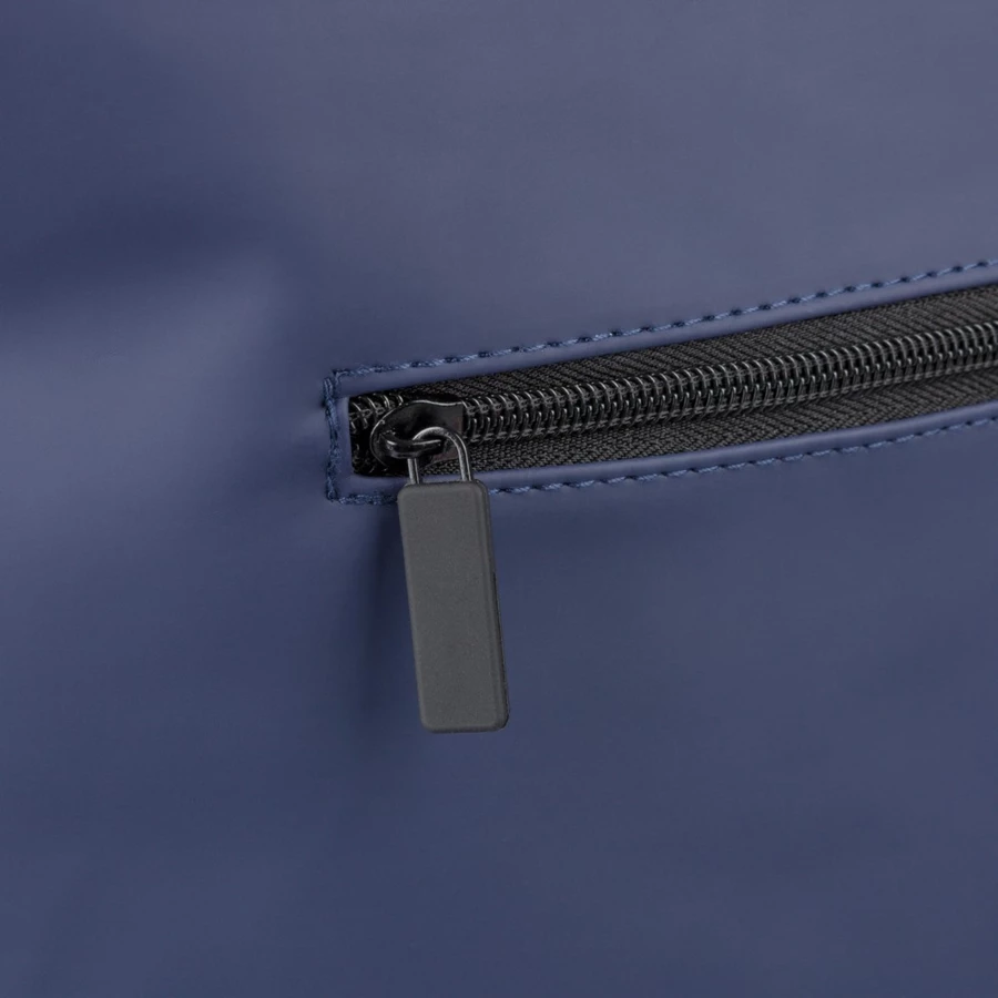 Zwijany plecak o pojemności 19 litrów, mała kieszeń zapinana na zamek z przodu, zwijana główna kieszeń zamykana na rzep, przegroda na laptopa 16" w środku, regulowane wentylowane paski na ramię, uchwyt z wierzchu ułatwiający noszenie, podszewka z poliestru 210D, ikona recyklingu na metce, produkt wykonany z PU z recyklingu i poliestru