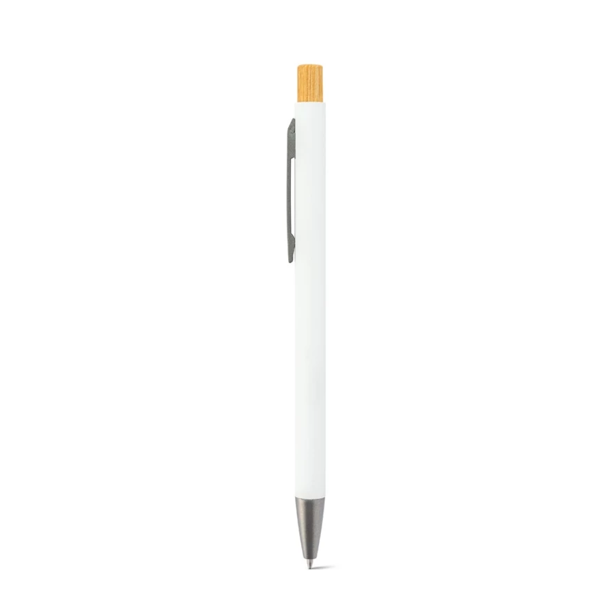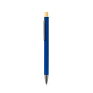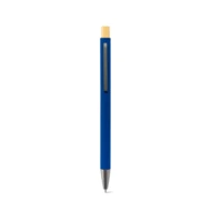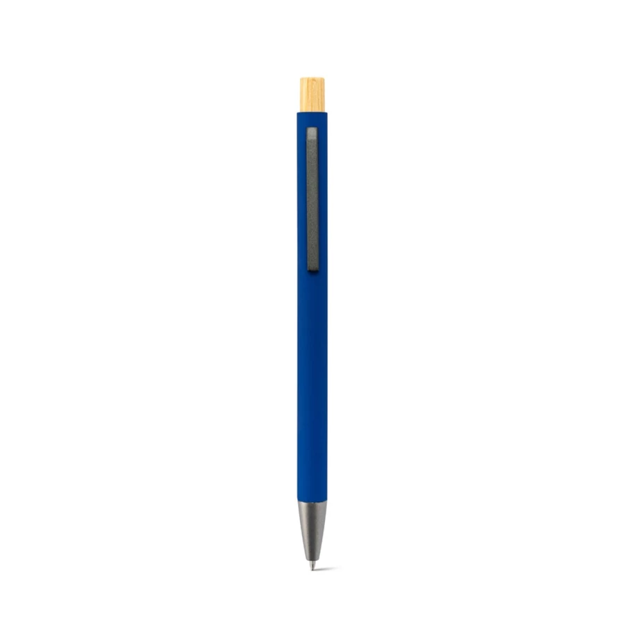 Długopis z recyklingowanego aluminium (100% RAL) z gumowym wykończeniem. Jego minimalistyczny design łączy matowe metaliczne szare detale i bambusowy przycisk u góry. Posiada klips i niebieski kolor pisma. Ponieważ produkt jest wykonany z naturalnych materiałów, kolor produktu oraz wynik drukowania mogą się różnić w zależności od produktu. ø9 x 135 mm