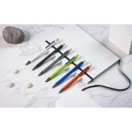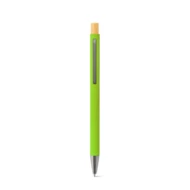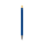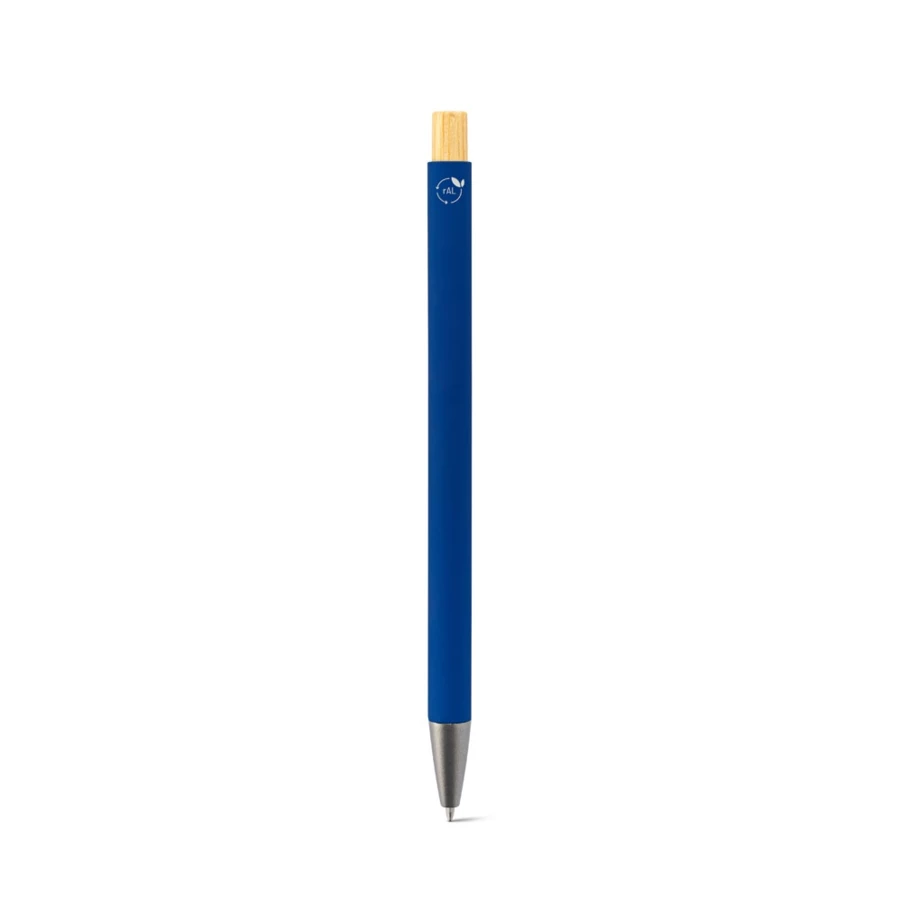 Długopis z recyklingowanego aluminium (100% RAL) z gumowym wykończeniem. Jego minimalistyczny design łączy matowe metaliczne szare detale i bambusowy przycisk u góry. Posiada klips i niebieski kolor pisma. Ponieważ produkt jest wykonany z naturalnych materiałów, kolor produktu oraz wynik drukowania mogą się różnić w zależności od produktu. ø9 x 135 mm