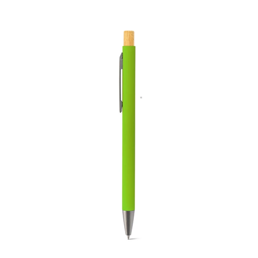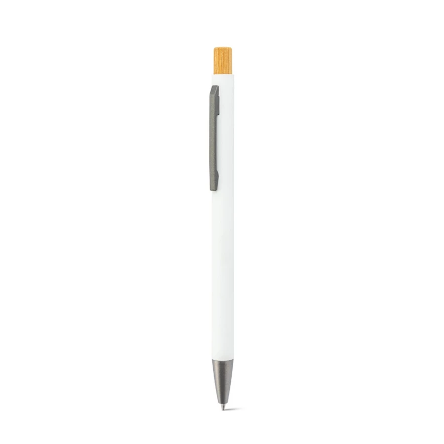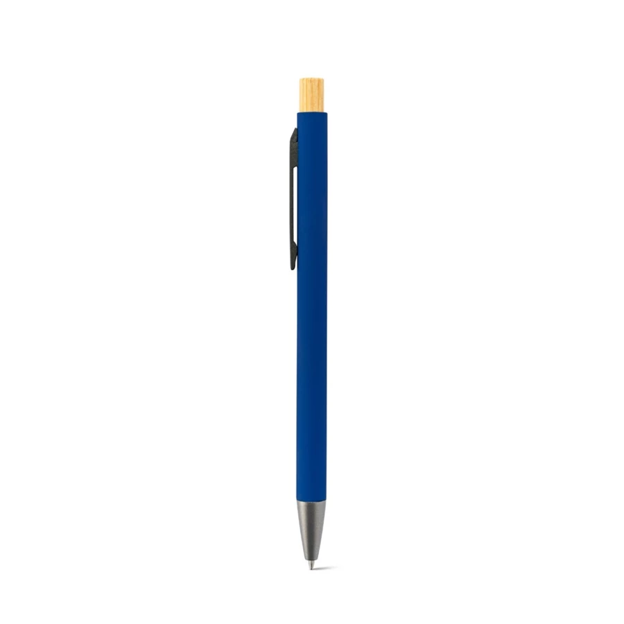 Długopis z recyklingowanego aluminium (100% RAL) z gumowym wykończeniem. Jego minimalistyczny design łączy matowe metaliczne szare detale i bambusowy przycisk u góry. Posiada klips i niebieski kolor pisma. Ponieważ produkt jest wykonany z naturalnych materiałów, kolor produktu oraz wynik drukowania mogą się różnić w zależności od produktu. ø9 x 135 mm